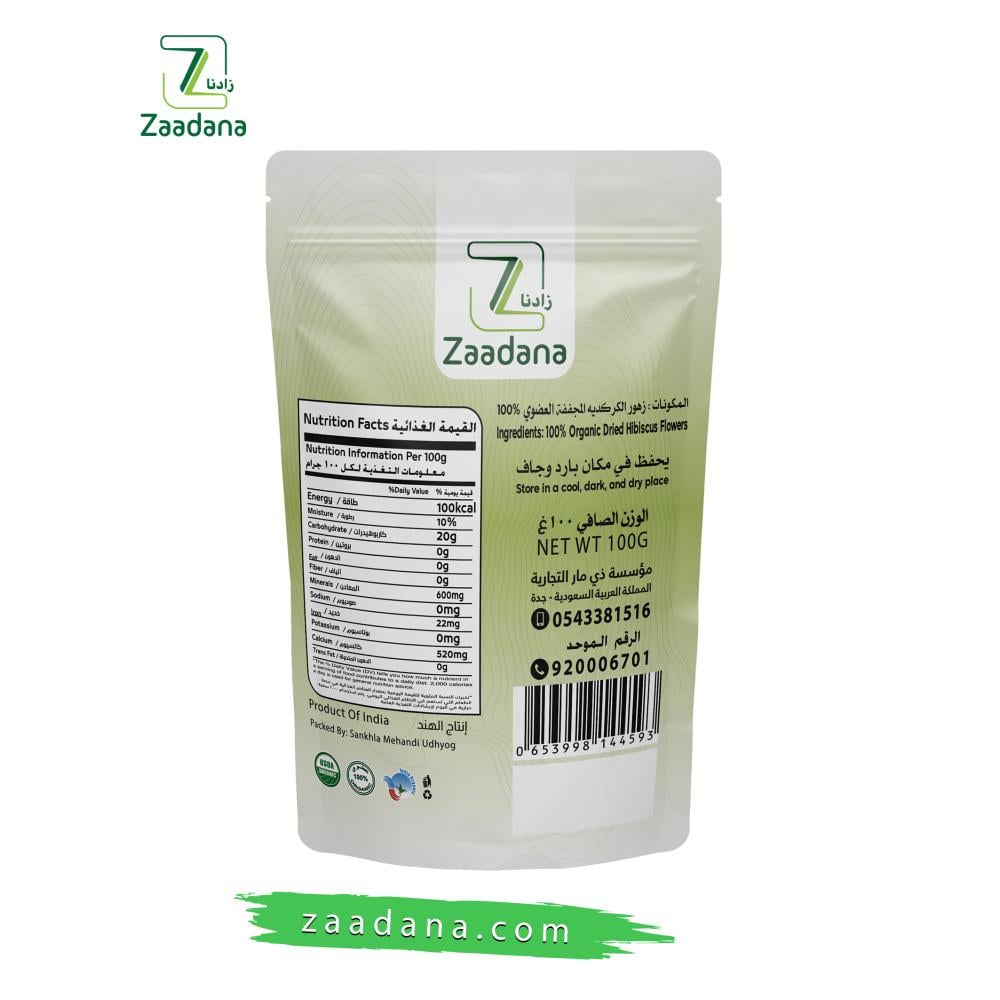 - المكونات: زهور الكركديه المجففة العضوي 100%.